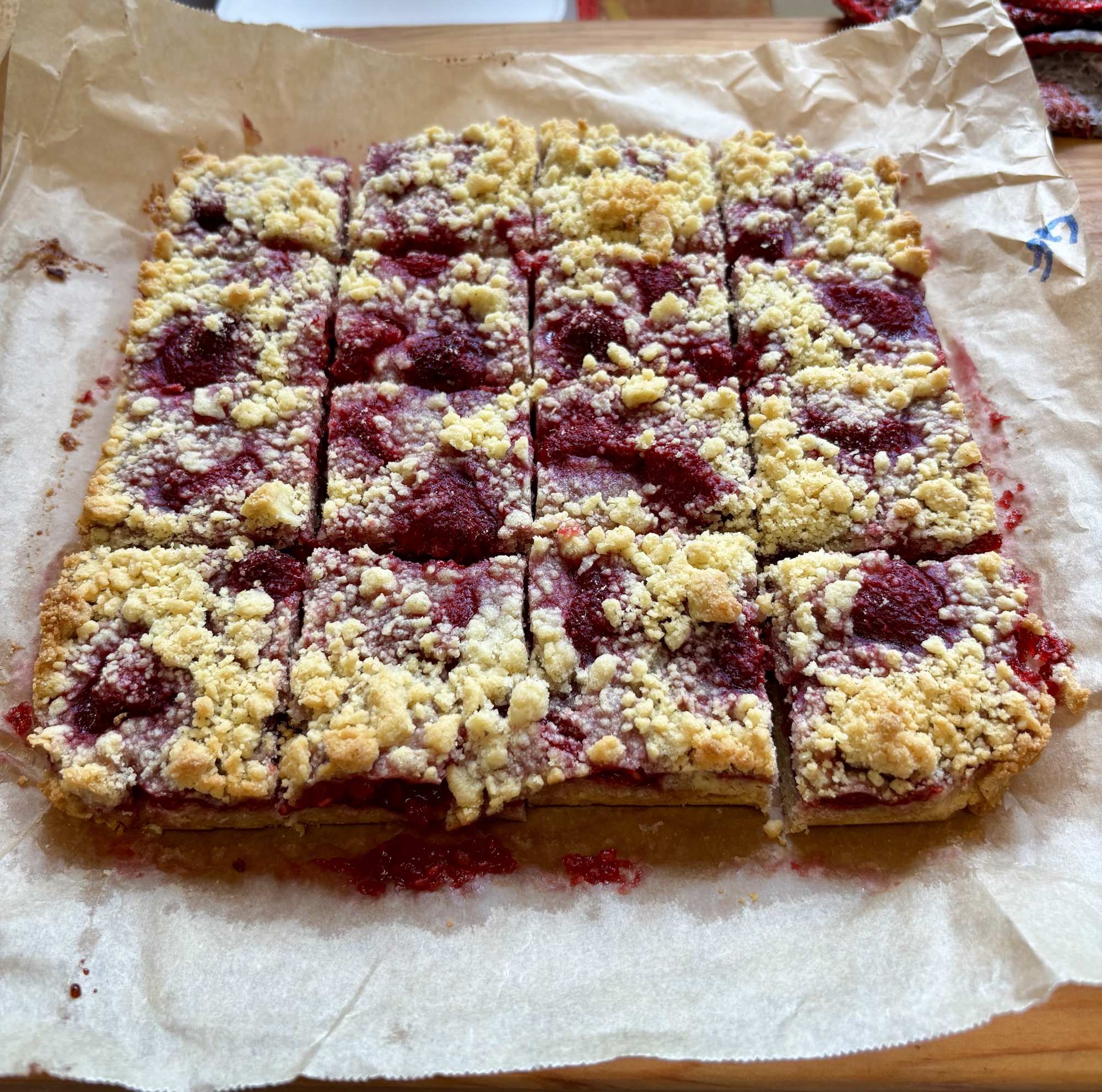 Bake for about 40-45 minutes until the crumble is toasty brown and the jam berry mixture is bubbling.