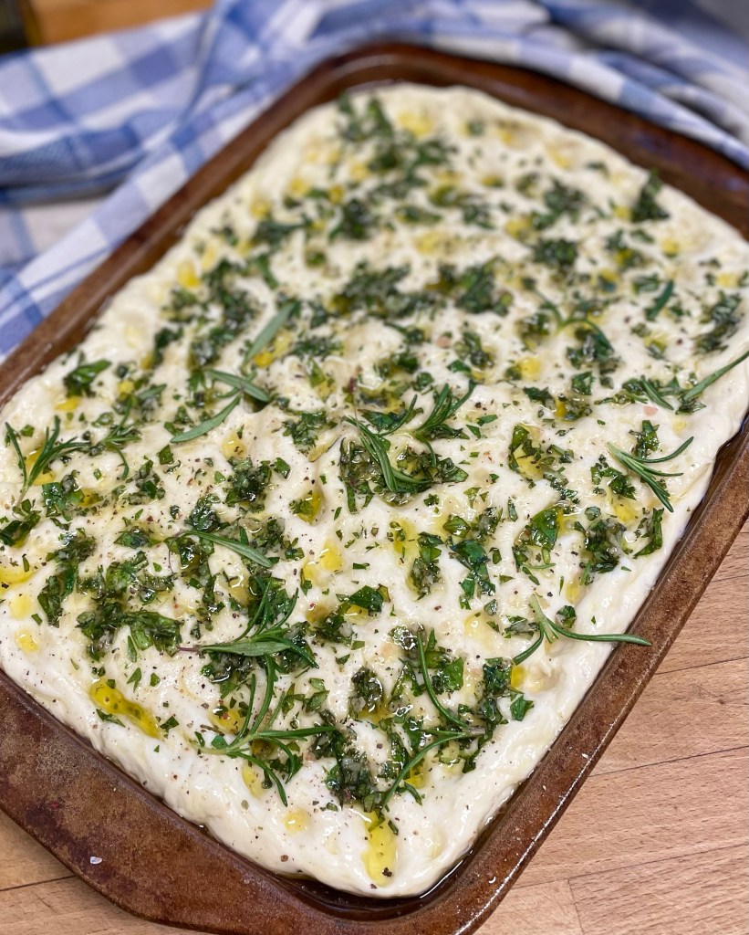 Drizzle herbed olive oil over dimpled dough and allow it to fill in the dimples, I like to be generous with the herb oil mixture.
