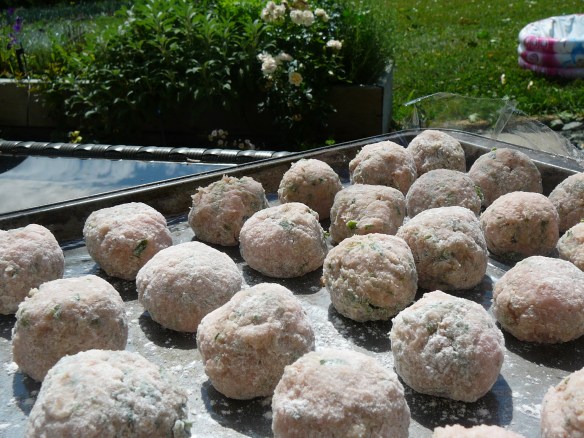 Do you ever wonder what you can do to help when someone has a baby? Has surgery? Just can’t get out of the house? Needs assistance of any kind? Make a freezer full of ready to go meal ideas, that’s what. This is our favourite way of helping anybody. Just make sure you find out first what kind of food they like to eat – after all, it is about what their household needs, not what you like to eat!! These chicken meatballs are one of the best and easiest to do – they can be frozen individually and then tossed into a large ziplock bag so that when dinner comes around they can either go on the bbq and be served with tzatsiki dip, go into a tomato sauce and become spaghetti, or just served with mashed potatoes and vegetables. The possiblities are limited only by your imagination …