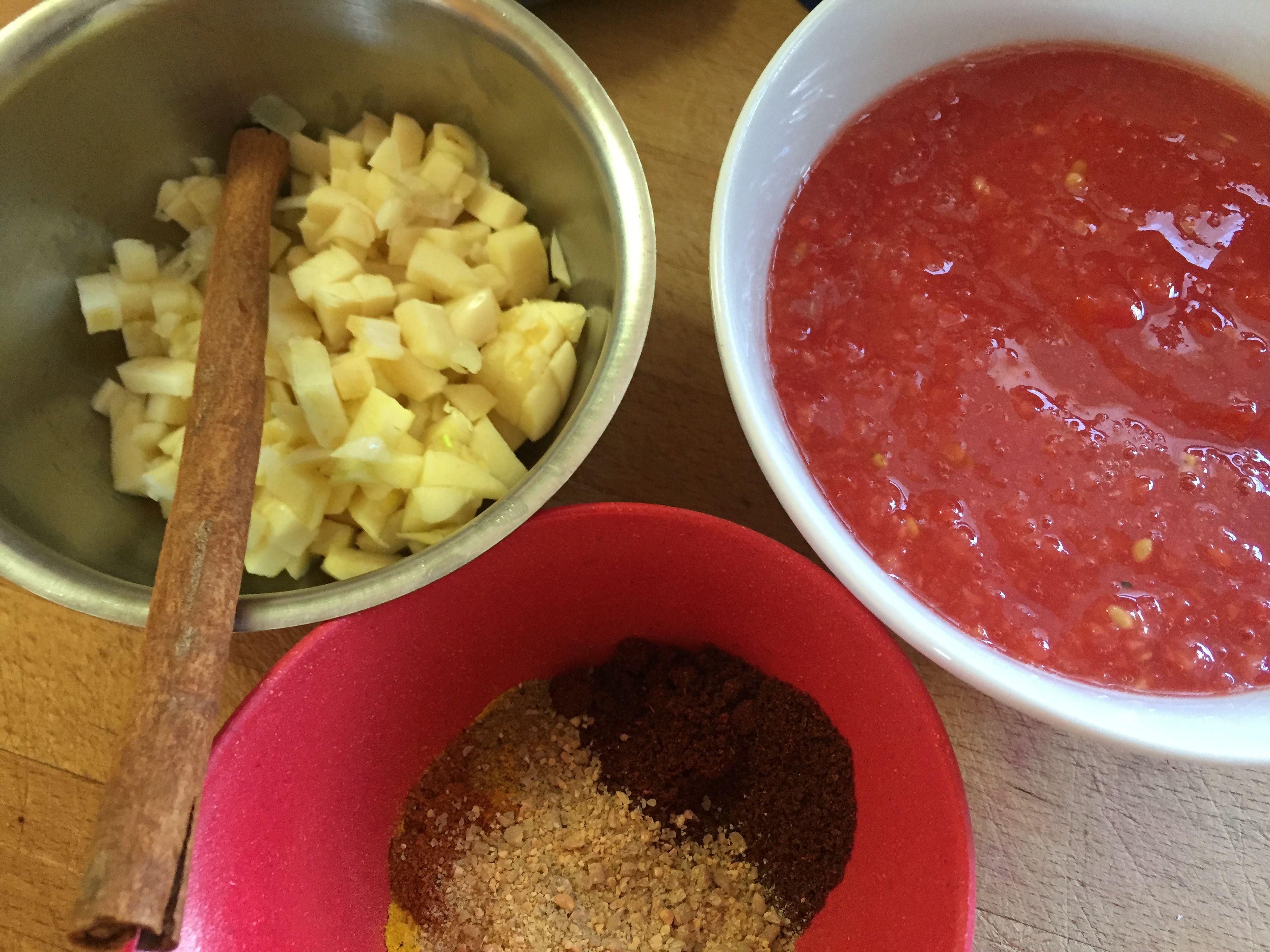 Reduce the heat to low and add tomatoes, fenugreek, cumin, turmeric, cayenne, chili and cinnamon bark. Stir well and slowly increase heat to medium. Allow to cook until the ghee starts to separate from the tomato mixture (you will notice pockets of clear liquid on top).